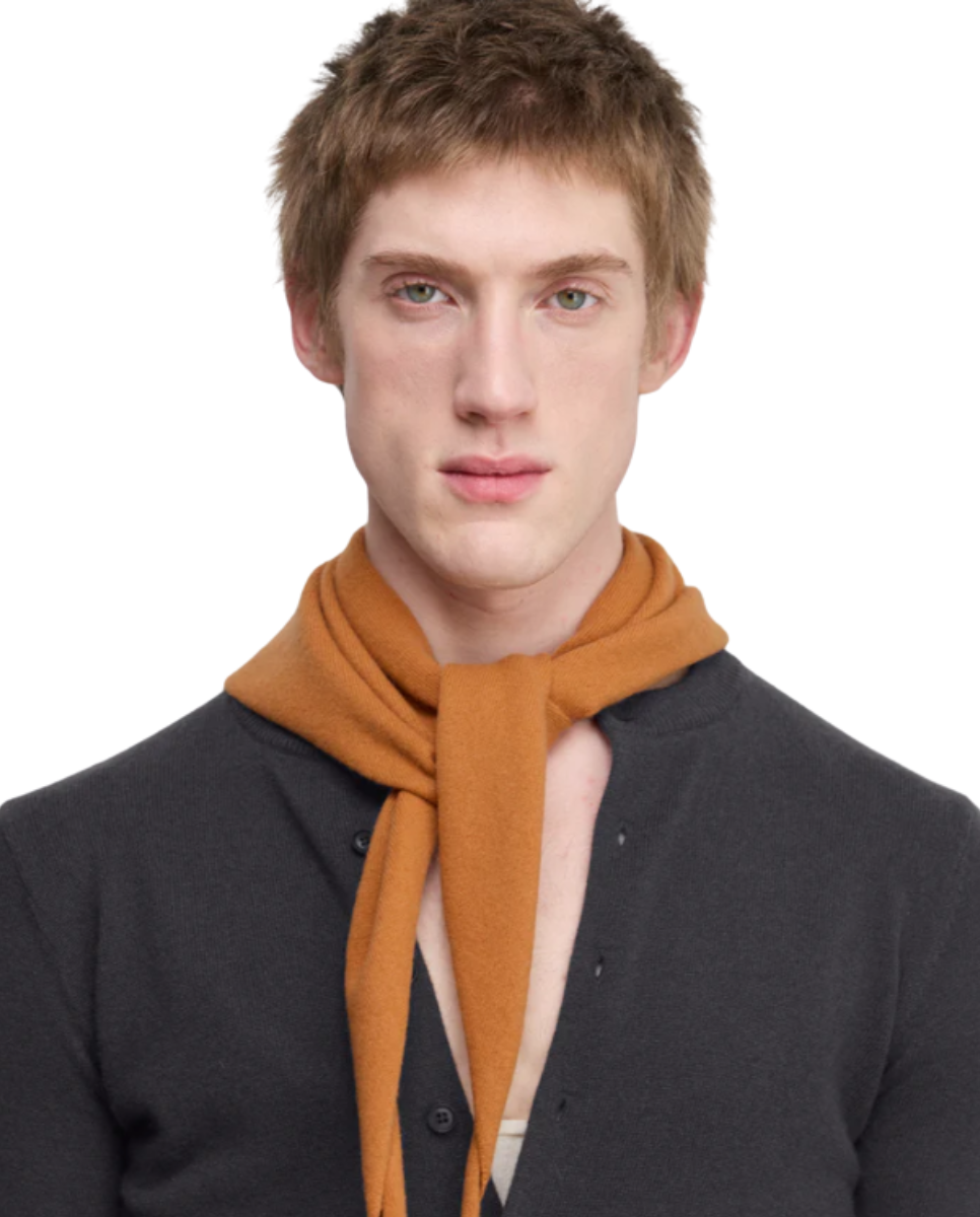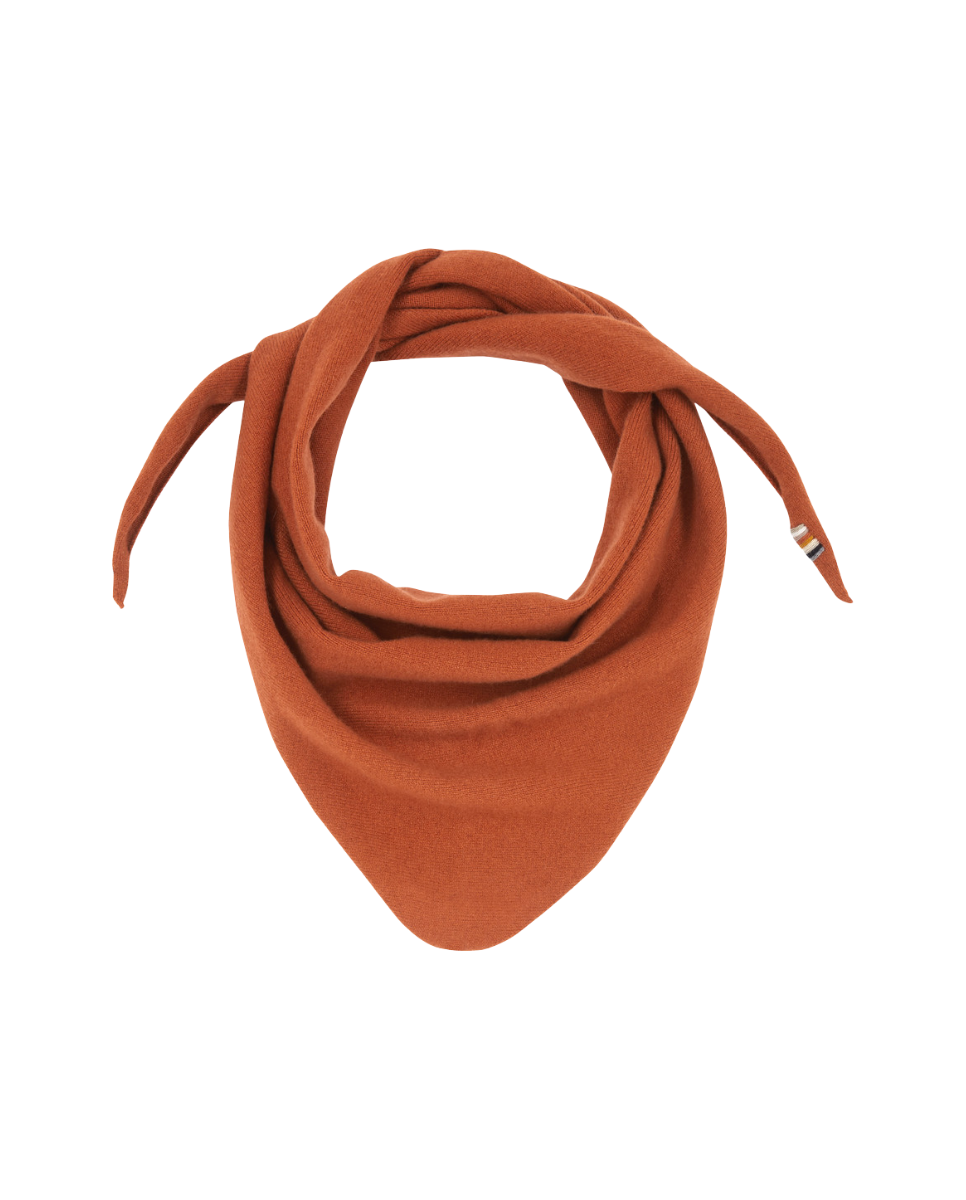 Triangle shaped cashmere bandana with rolling edges. This small cashmere scarf is the perfect universal accessory.