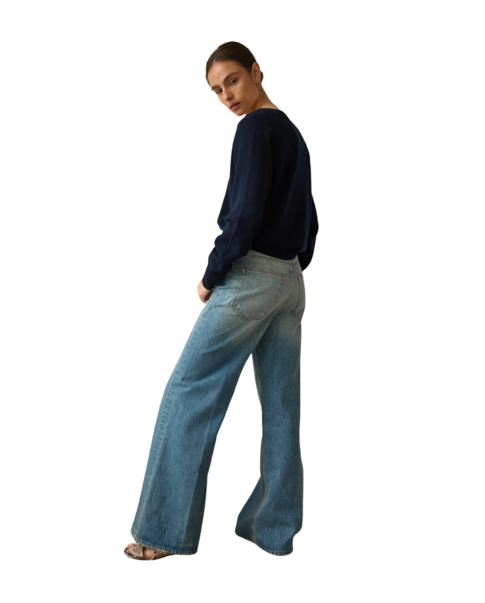 A five pocket 100% cotton jean designed to be relaxed in the leg and fitted on the hips. A mid rise that hits just below the natural waist with ease. Relaxed aka "the lax" jean has a loose leg is meant to be worn to slightly puddle in flats and skim with a kitten. A 32" inseam.