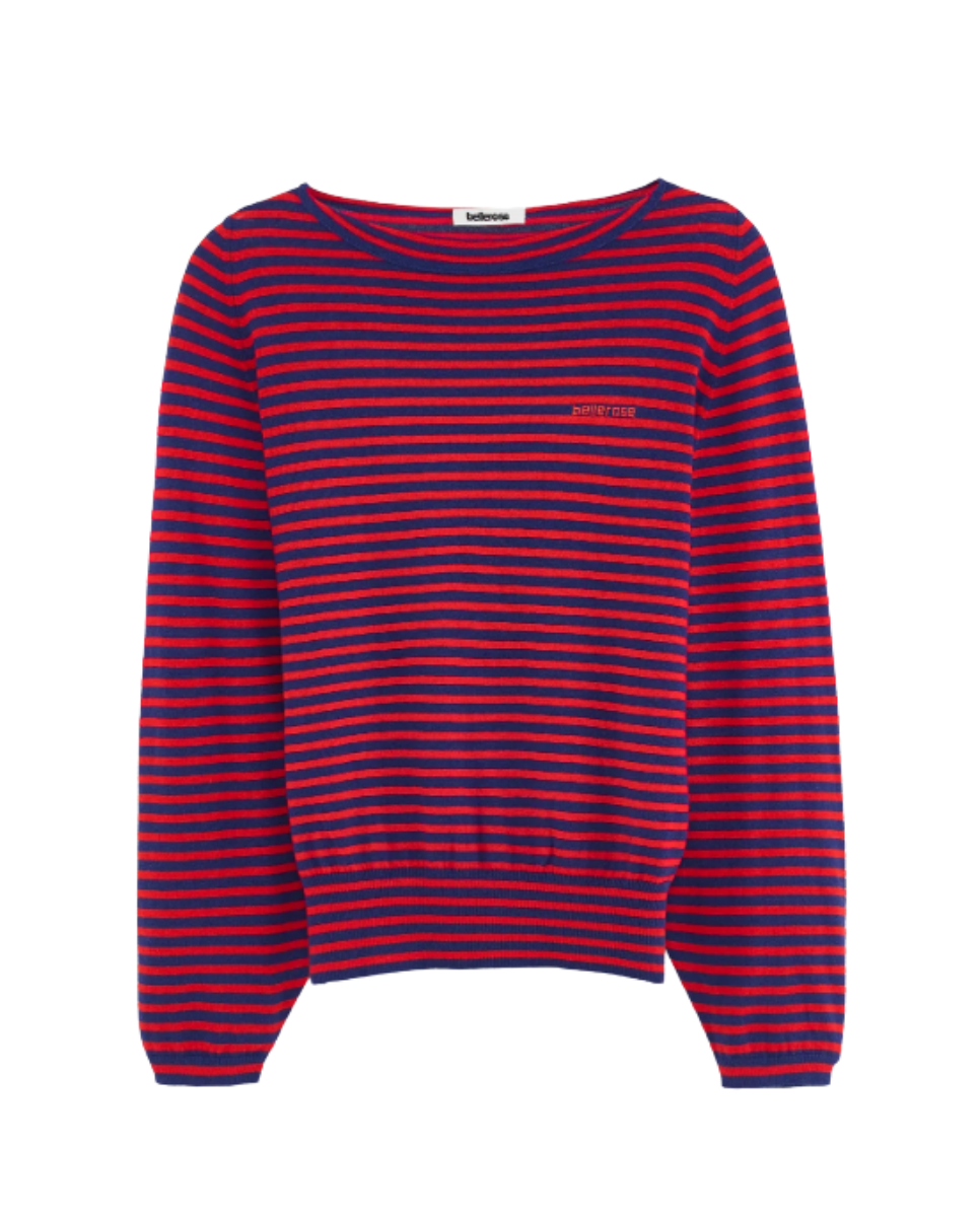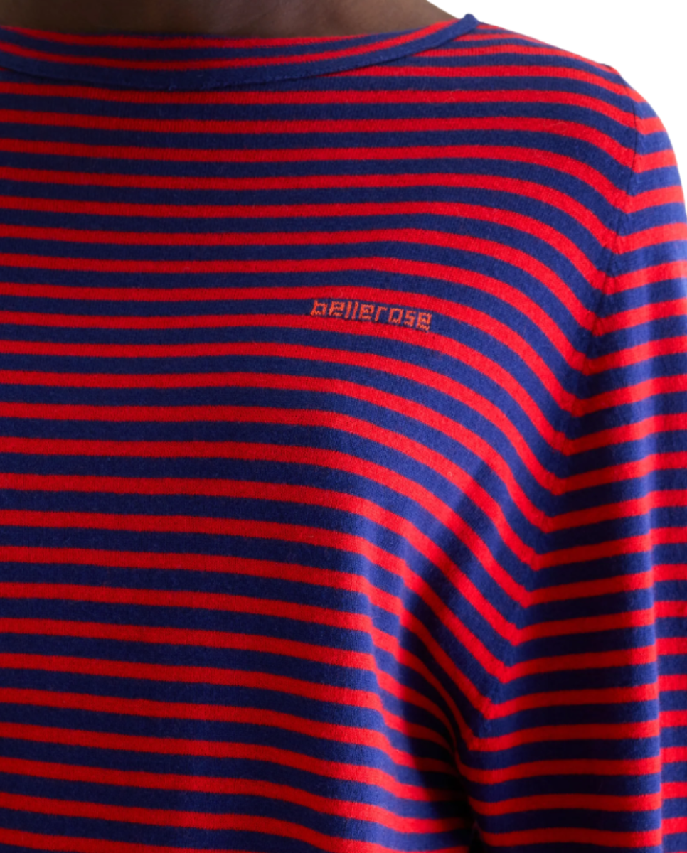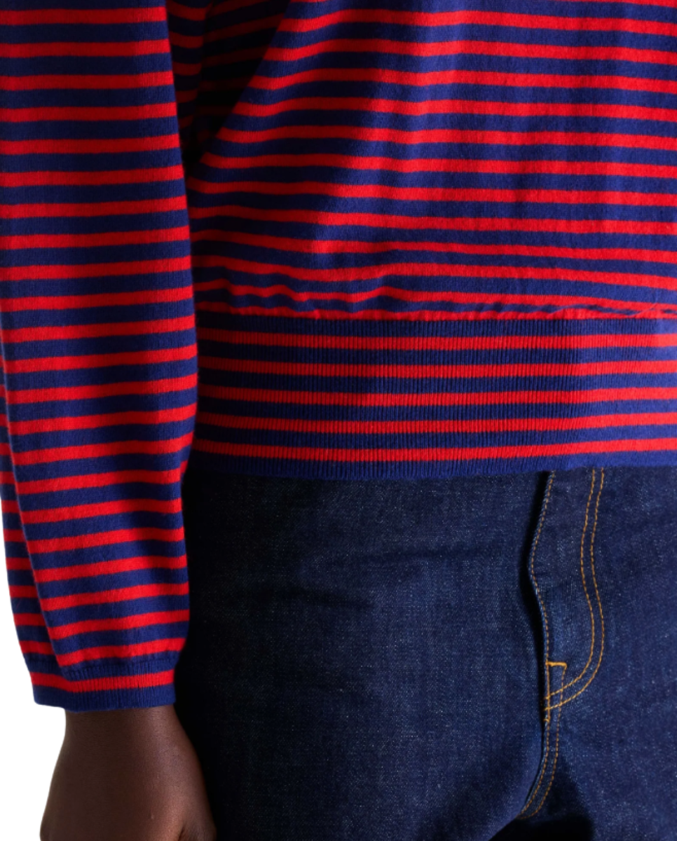 Relaxed long-sleeve fine-gauge knit sweater with red and navy stripes and a boat neck.