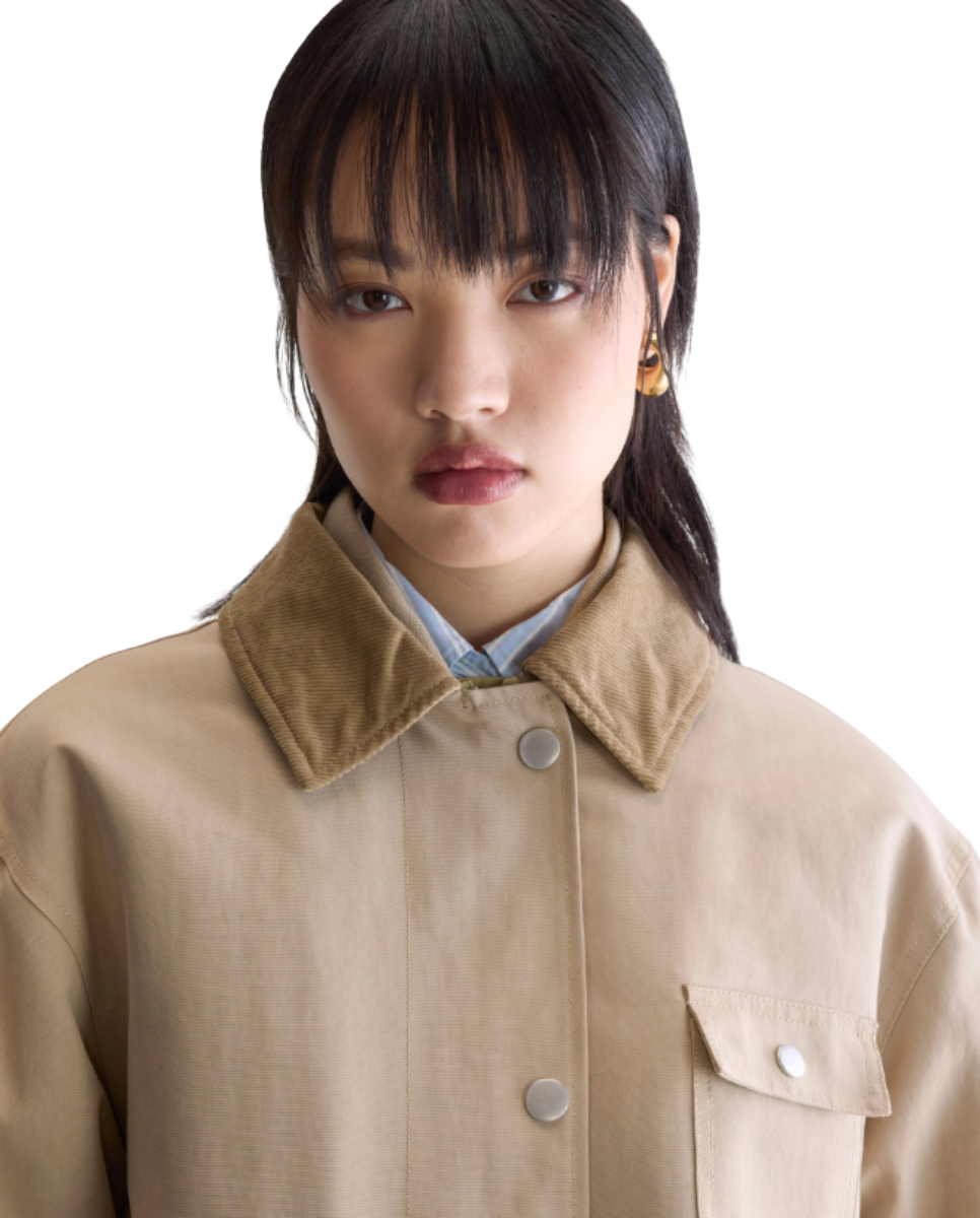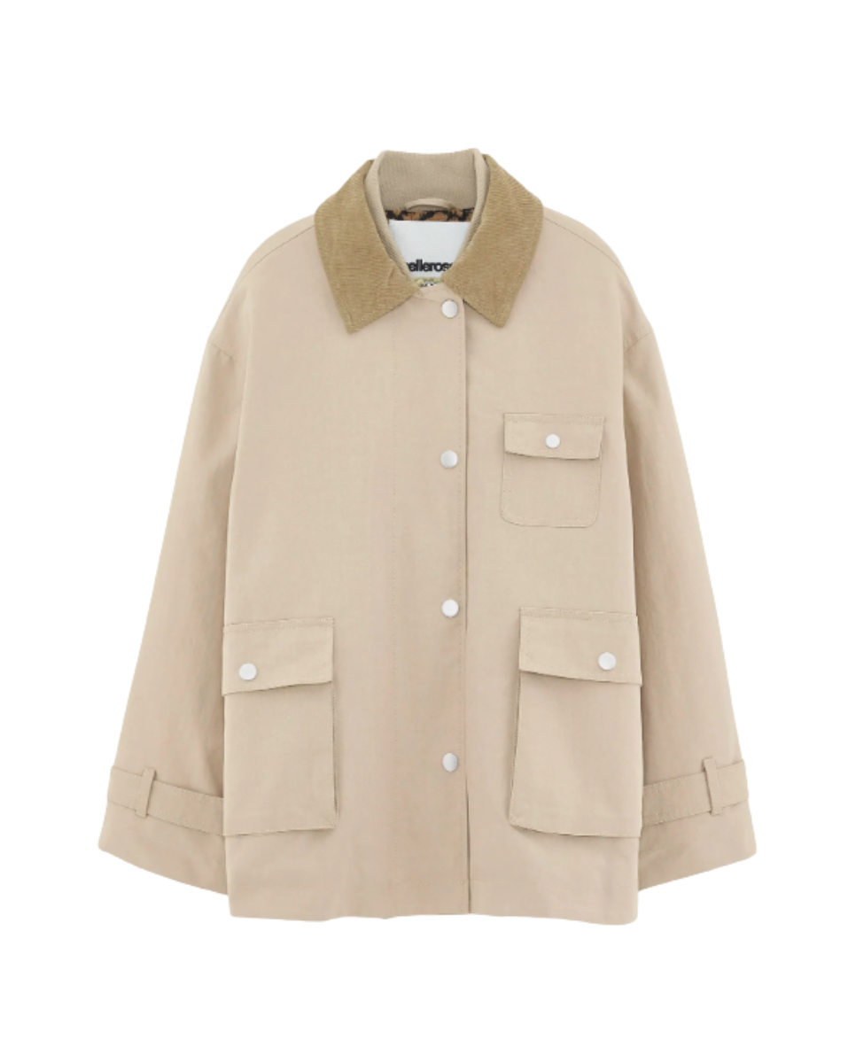 Relaxed cotton-blend jacket in greige with a corduroy collar, flap chest pocket, two front flap pockets, and leopard-print lining.
