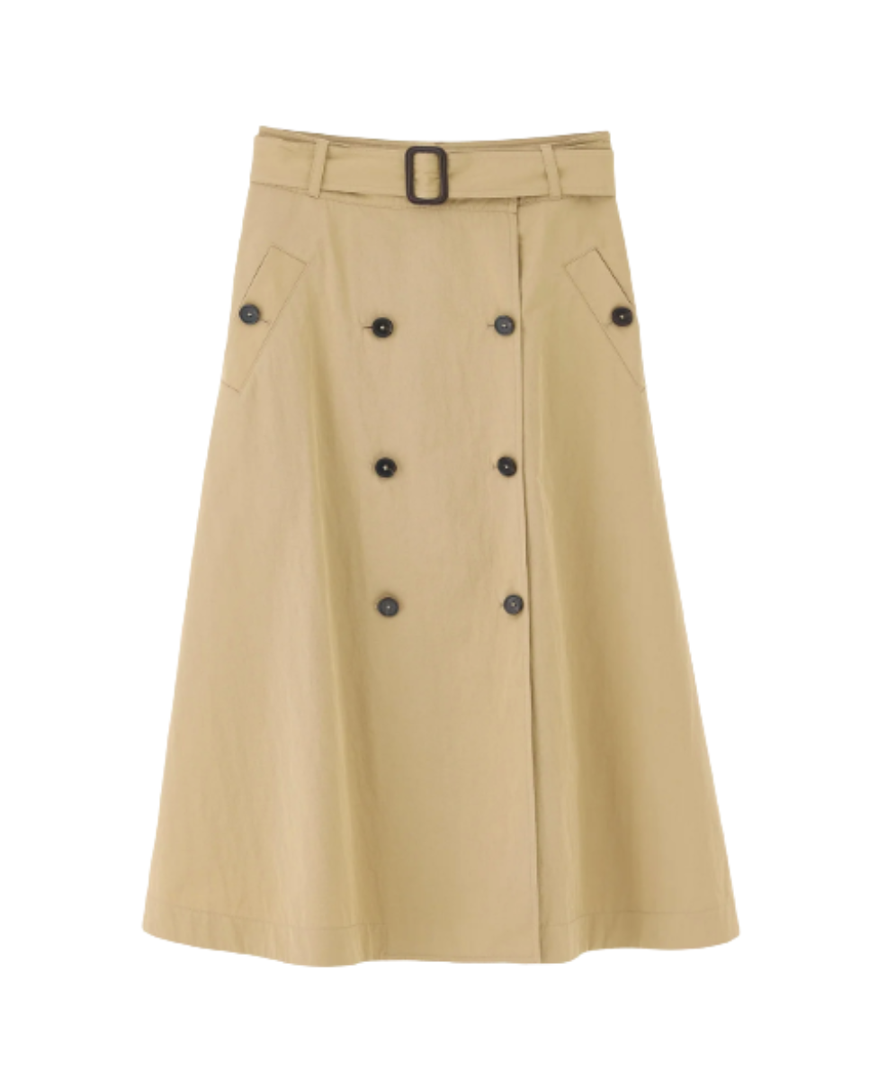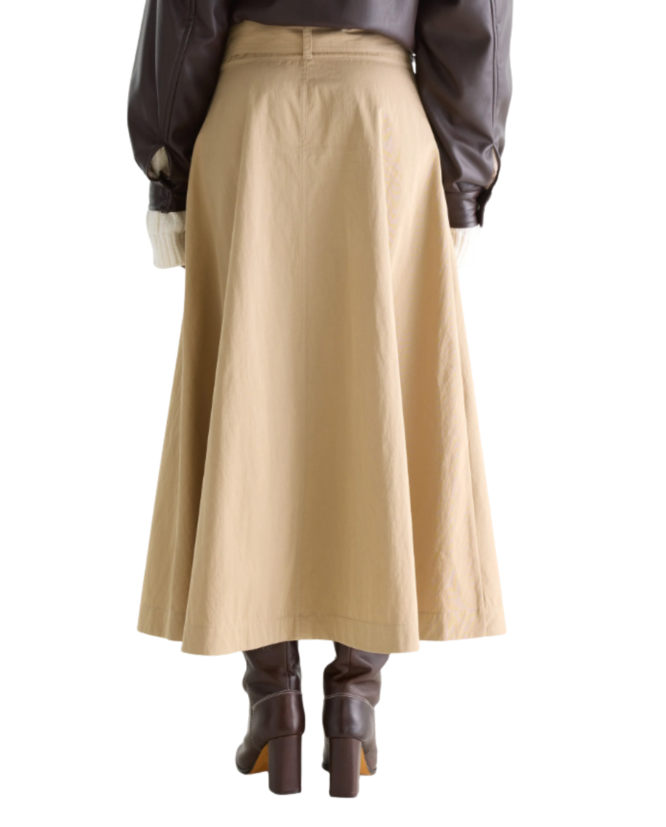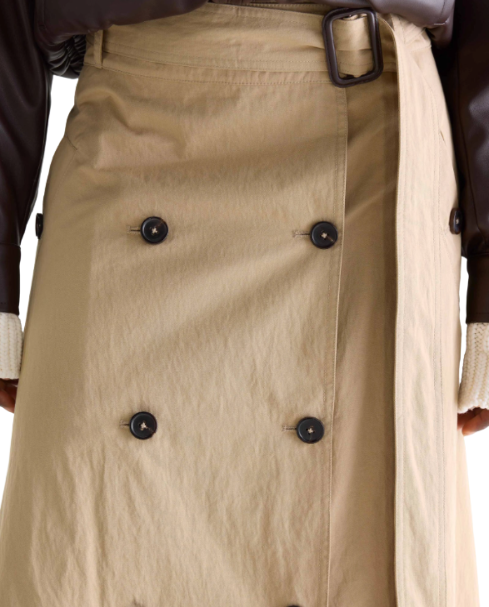Midi skirt in beige with trench-inspired detailing and a belted waist.