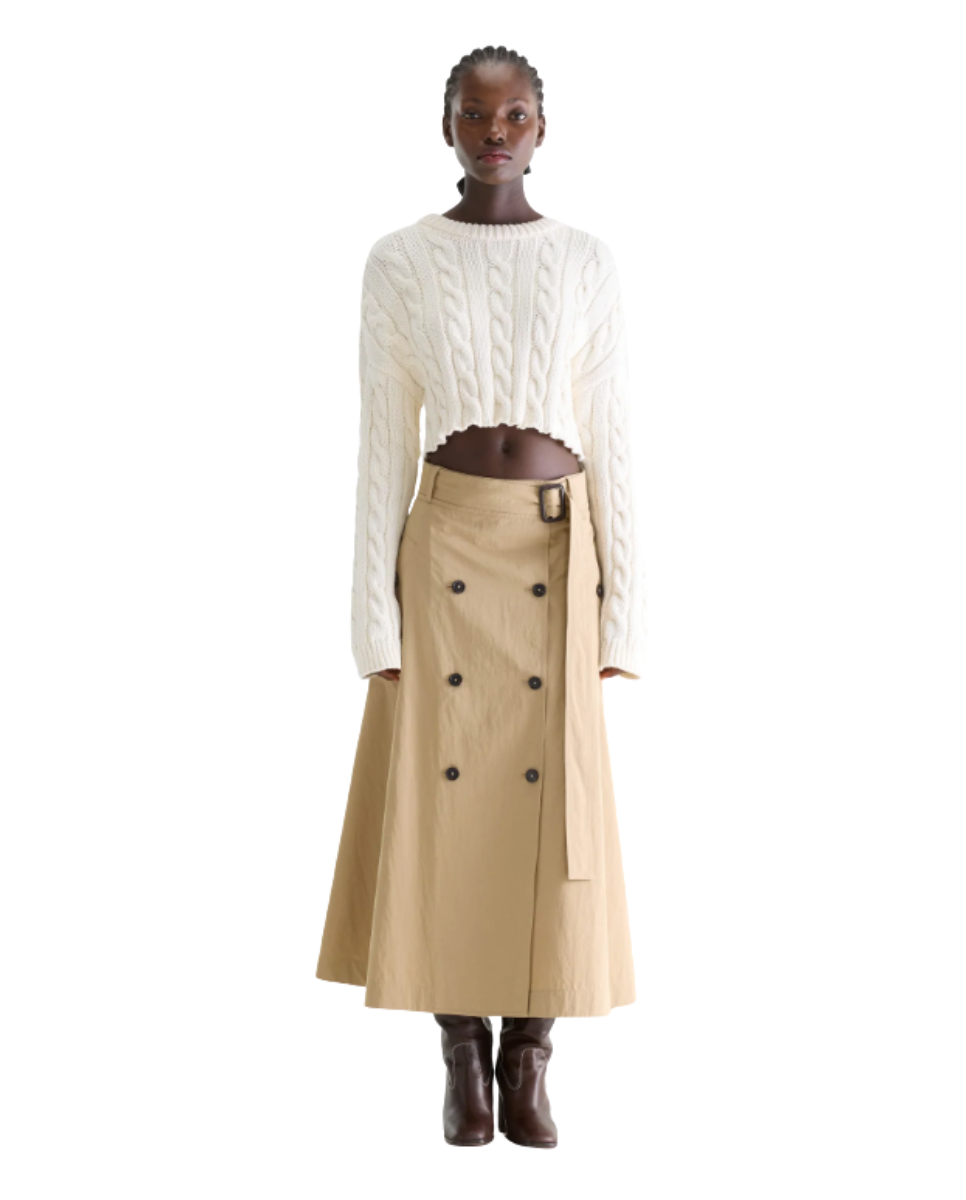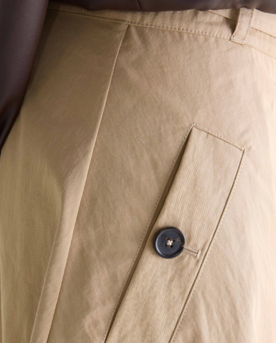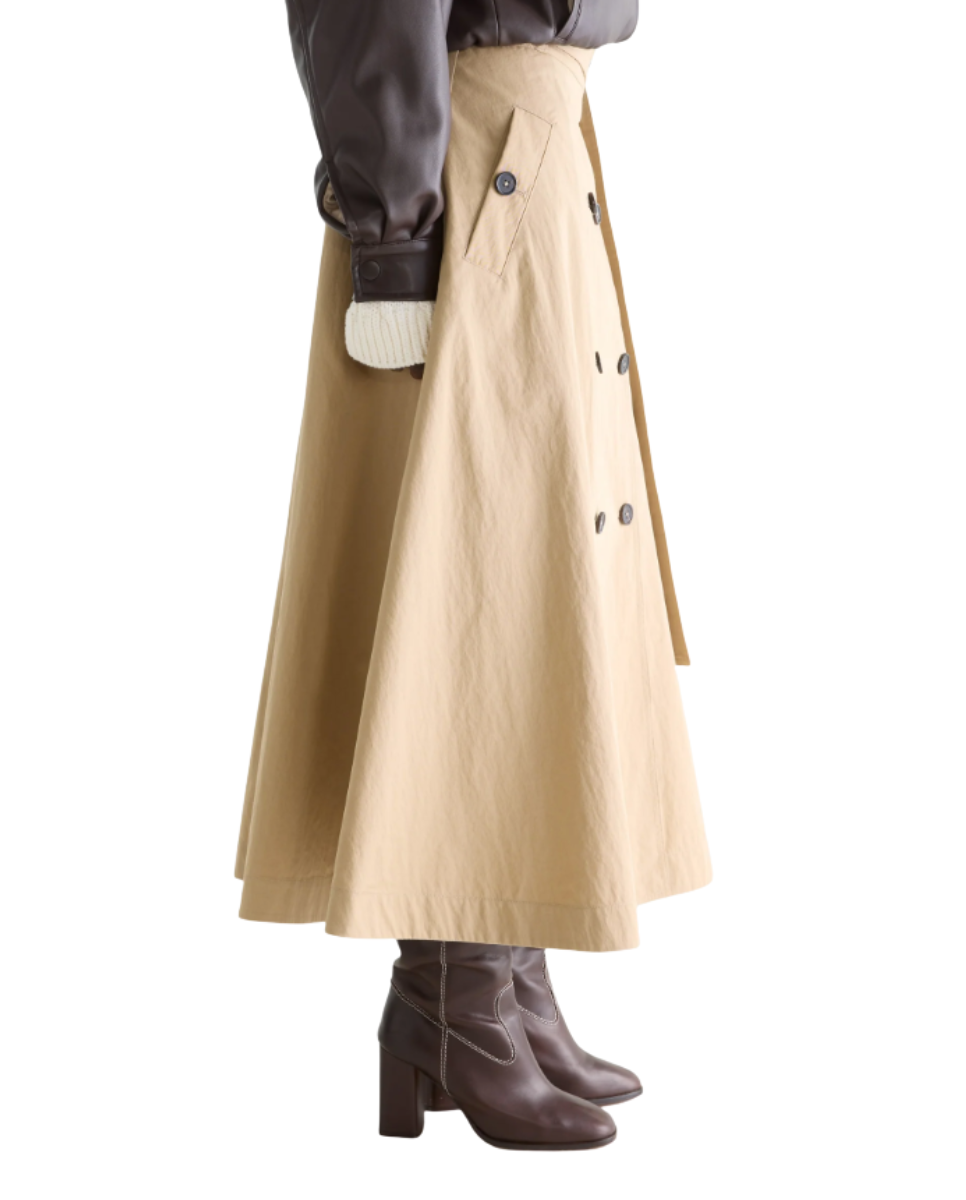 Midi skirt in beige with trench-inspired detailing and a belted waist.