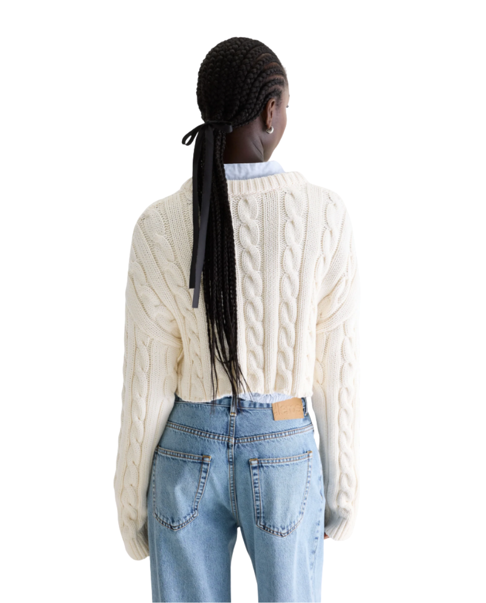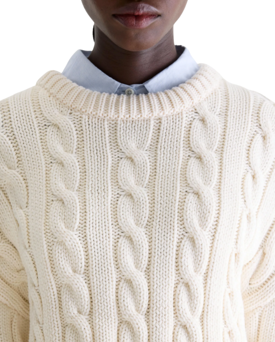 Cropped classic cable-knot sweater off-white with crewneck and ribbed trims.