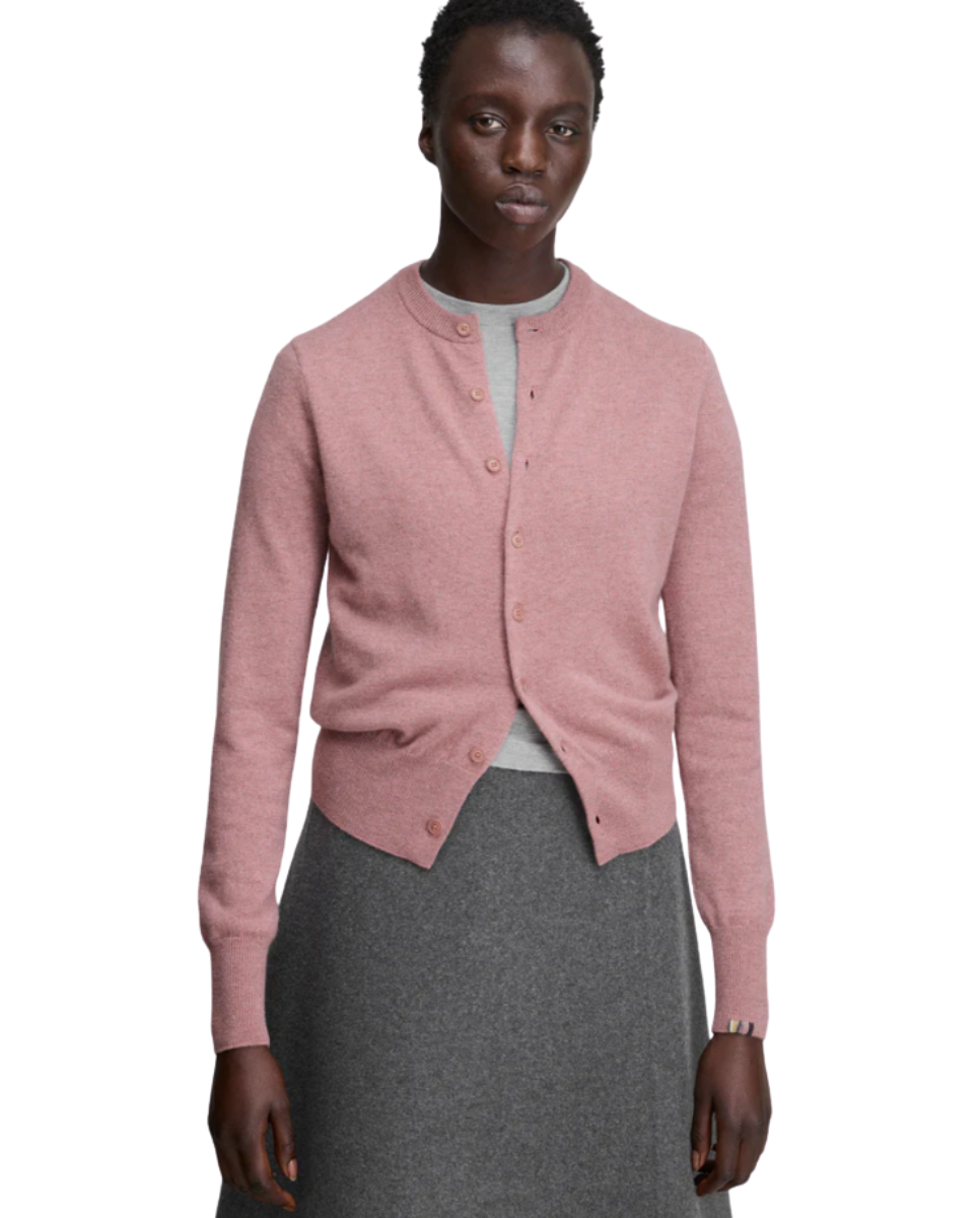 Classic cashmere crew-neck cardigan with eight buttons and a petite fit.