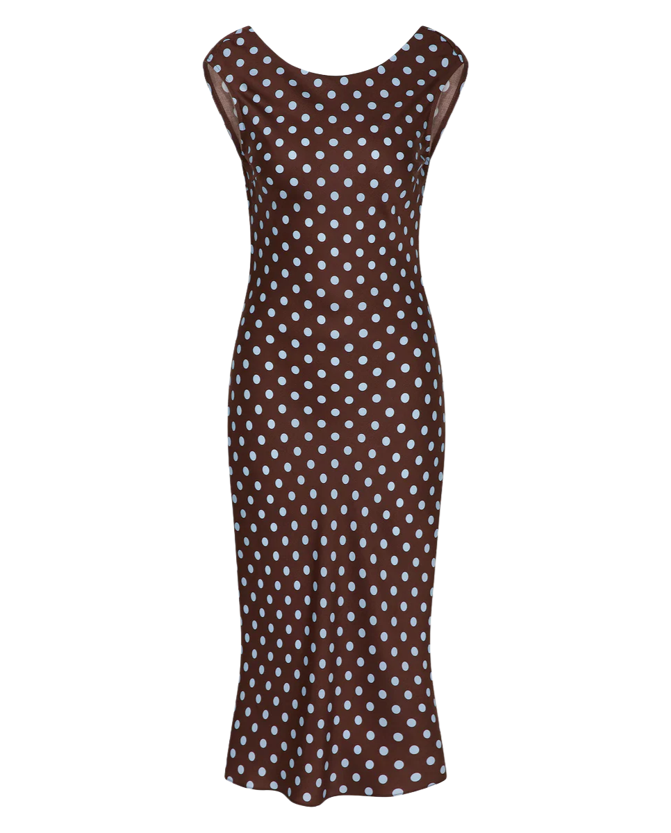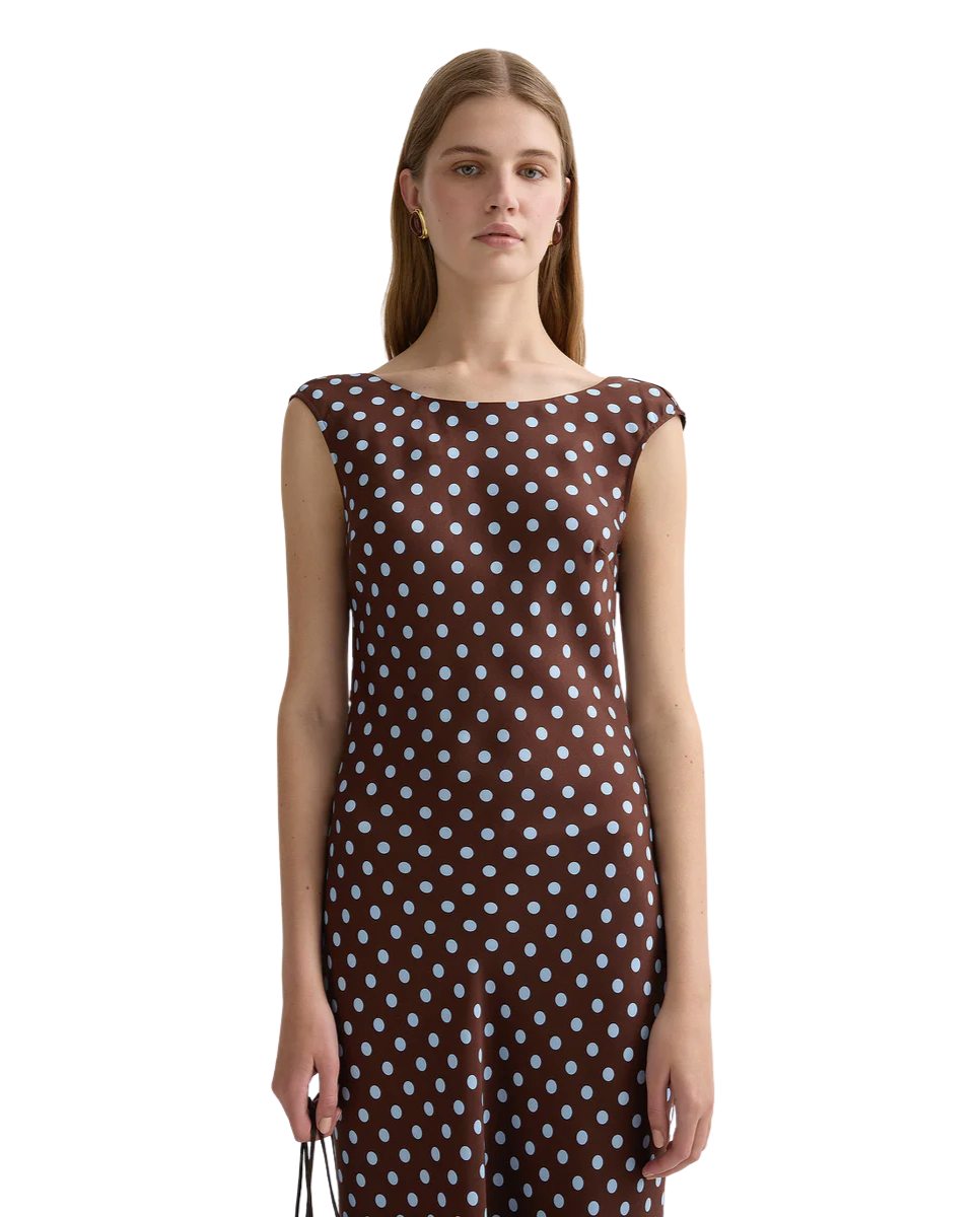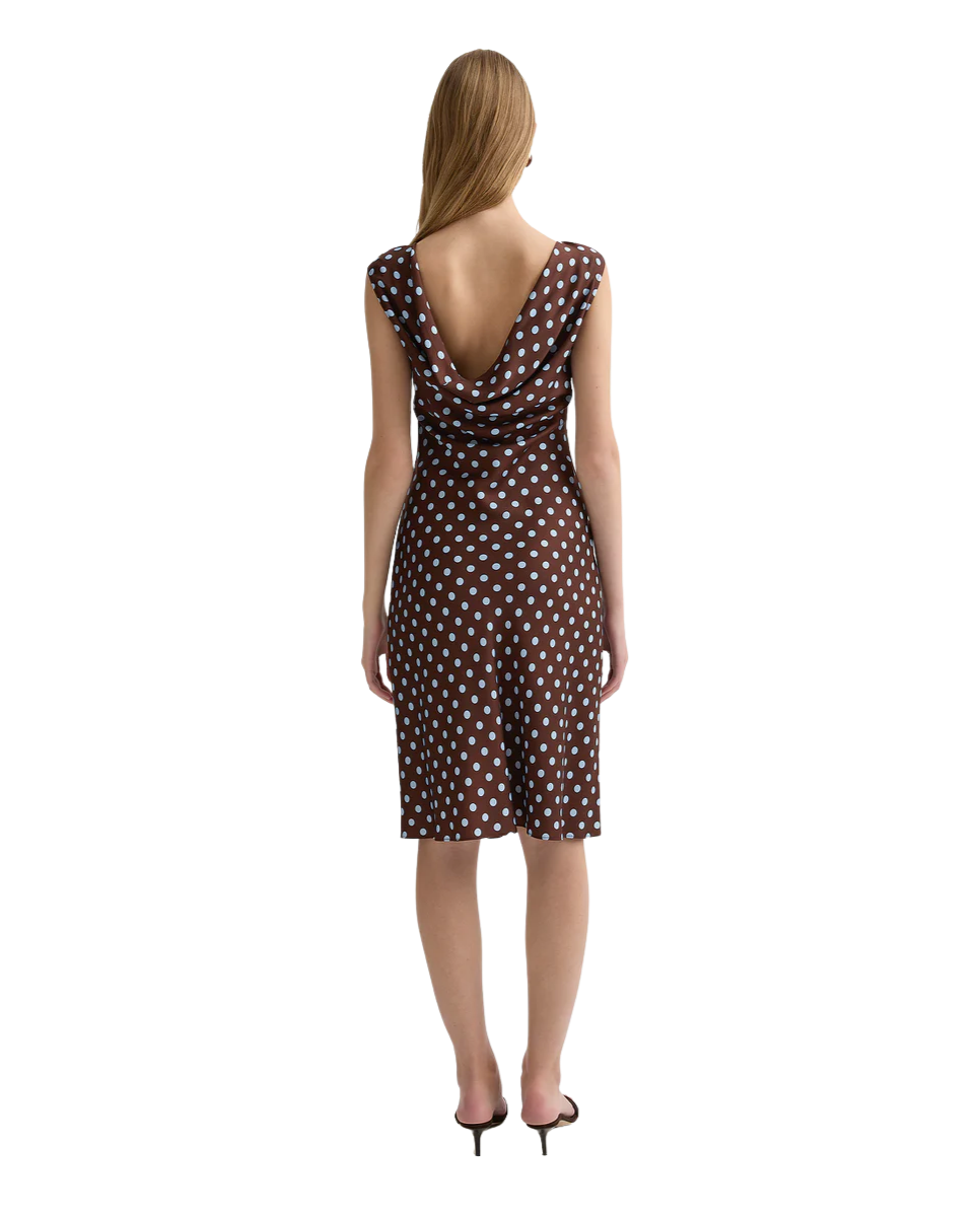 Cut from a soft, drapey Tencel, the Leo Dress features a signature polka dot print. Designed with a boat neckline, low cowl back, and a bias-cut silhouette that flatters the body.