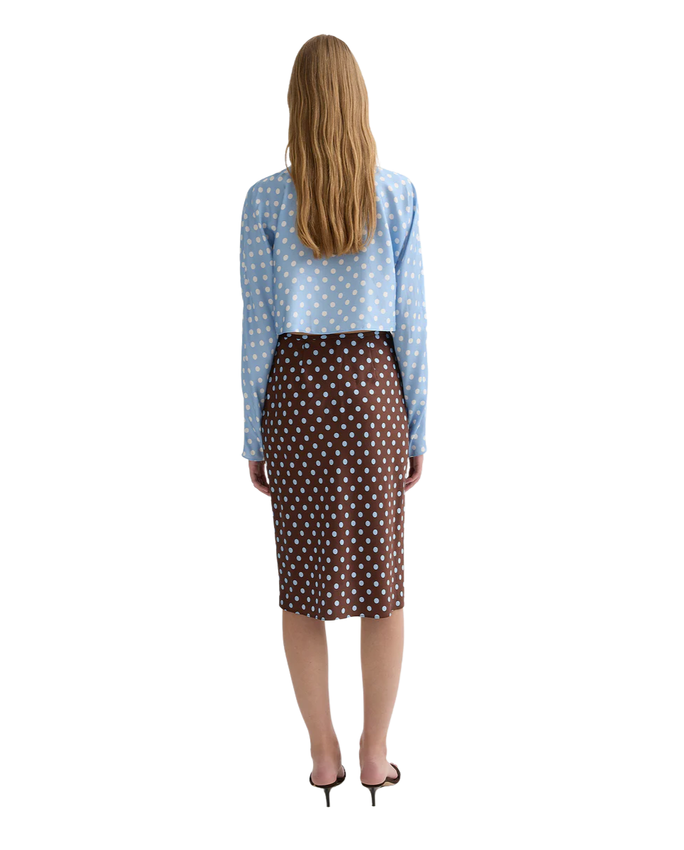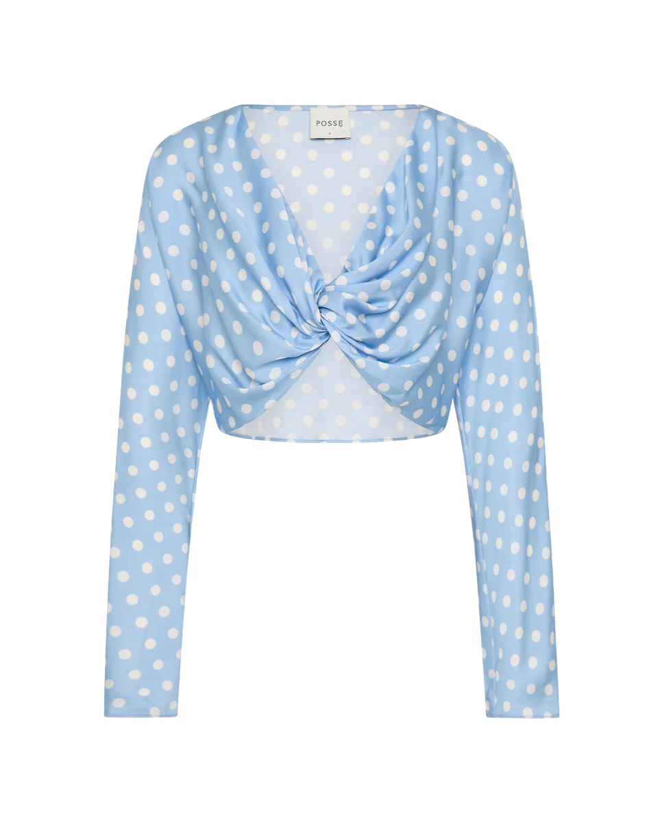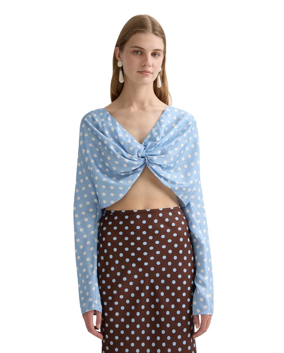 Cut from a soft, drapey Tencel, the Tillie Top is designed in a signature polka dot print. It features a front twist keyhole detail, long draping sleeves, and a cropped silhouette. Pair yours with the Leo Skirt.