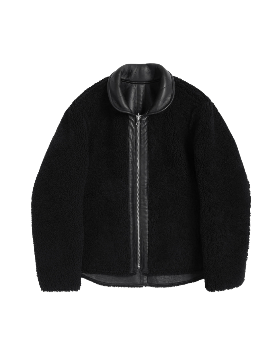 This reversible shearling leather jacket offers luxury, warmth, and versatility in one standout piece. Crafted from premium Nappa curly pile sheepskin, it features a soft, insulating shearling side and a sleek leather reverse, making it a statement jacket for all seasons. Designed with a shawl-style collar, raw edge cuffs and hem, and a leather strip detail along the center front and back, this jacket merges rugged elegance with a refined silhouette.