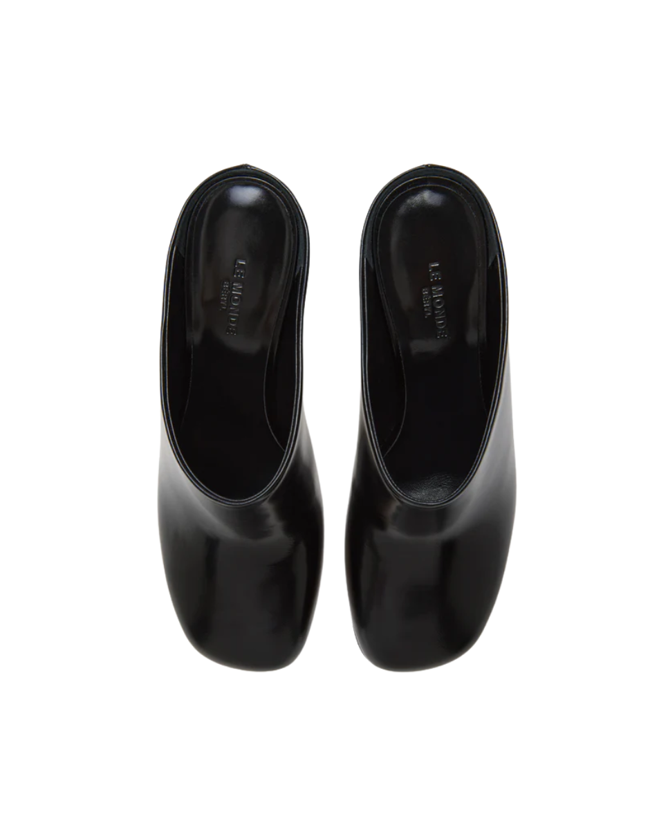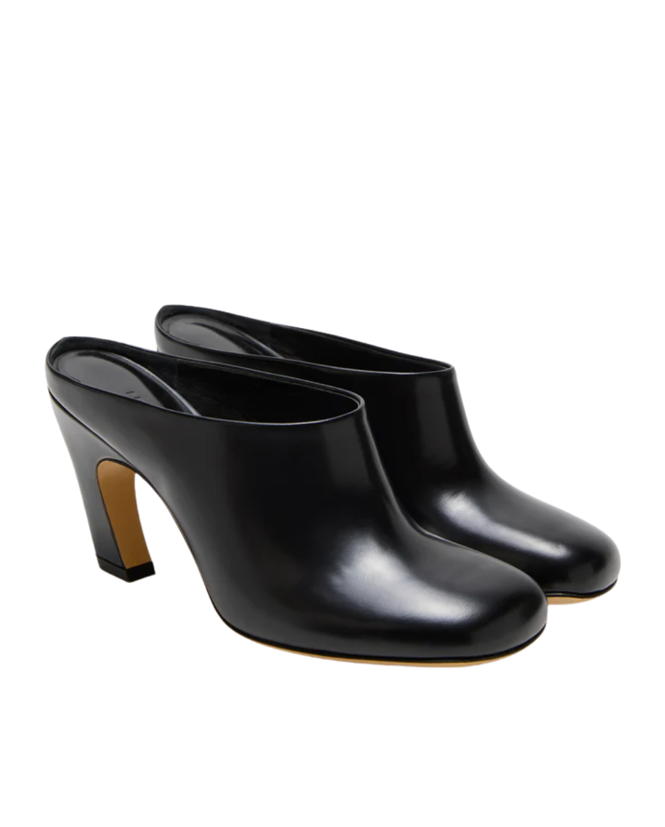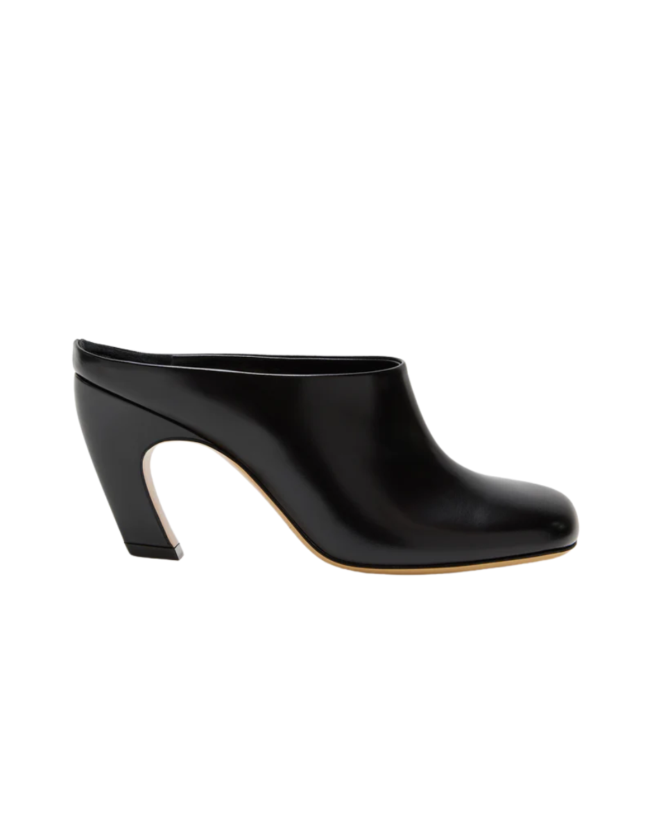 Mica Mule, handcrafted in distressed black spazzolato leather with a cushioned calf leather insole and 80mm curved heel. Slip on. Made in Italy.