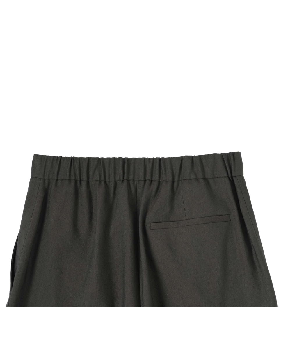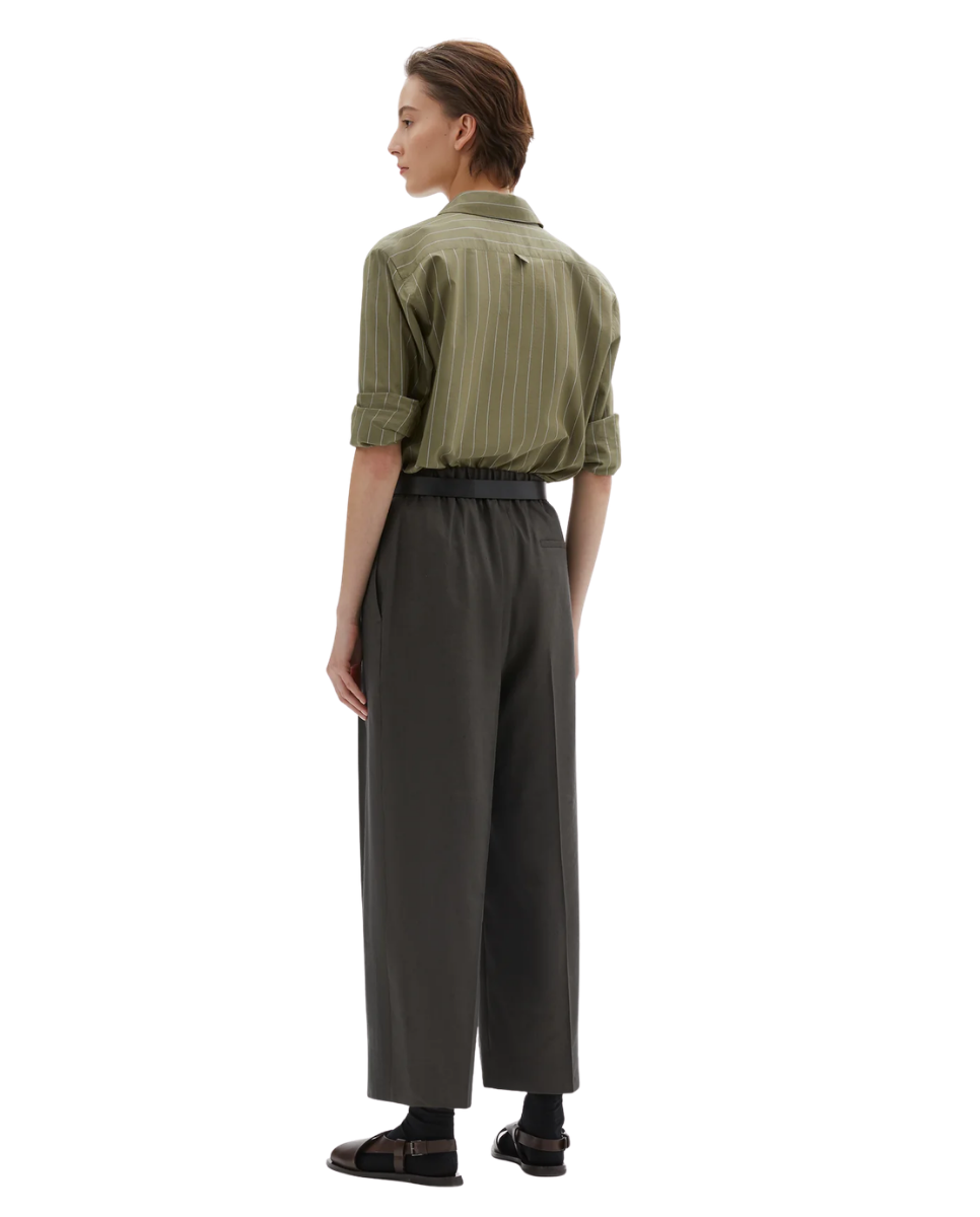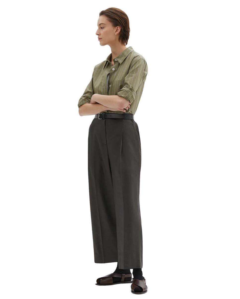 The Pleated Front Cropped Trousers have a relaxed cut and are fabricated in an ultra light linen silk blend with a dry, fluid hand feel and subtle raised nep finish. The slouchy, minimalist trousers are constructed with a button fastening, half-elasticated waistband, and welt back pocket.