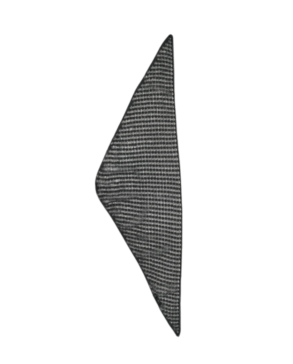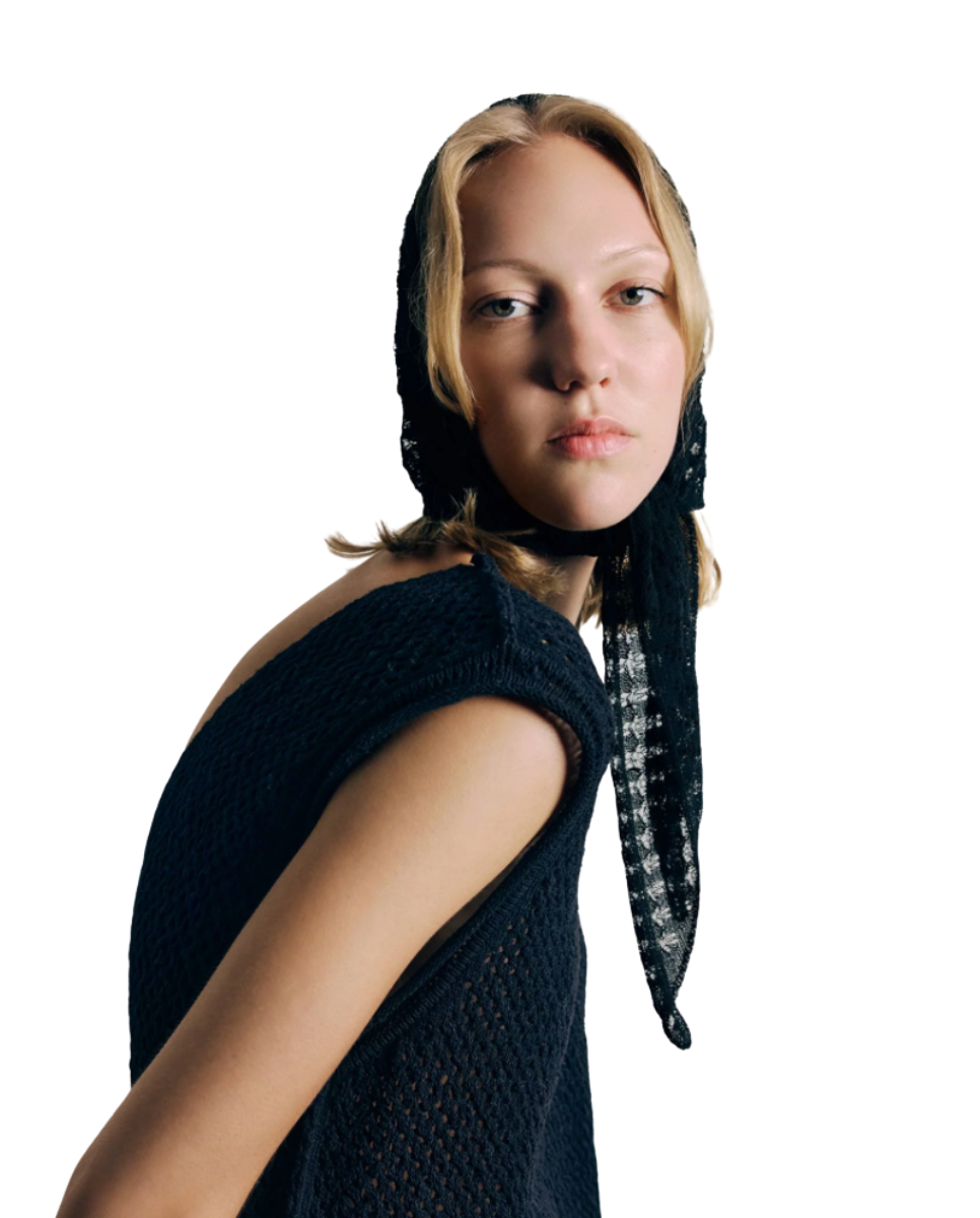 Triangle neck scarf knitted a lace-like open stitch from a corded organic cotton yarn with a dry hand feel.