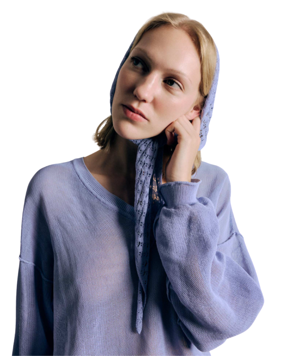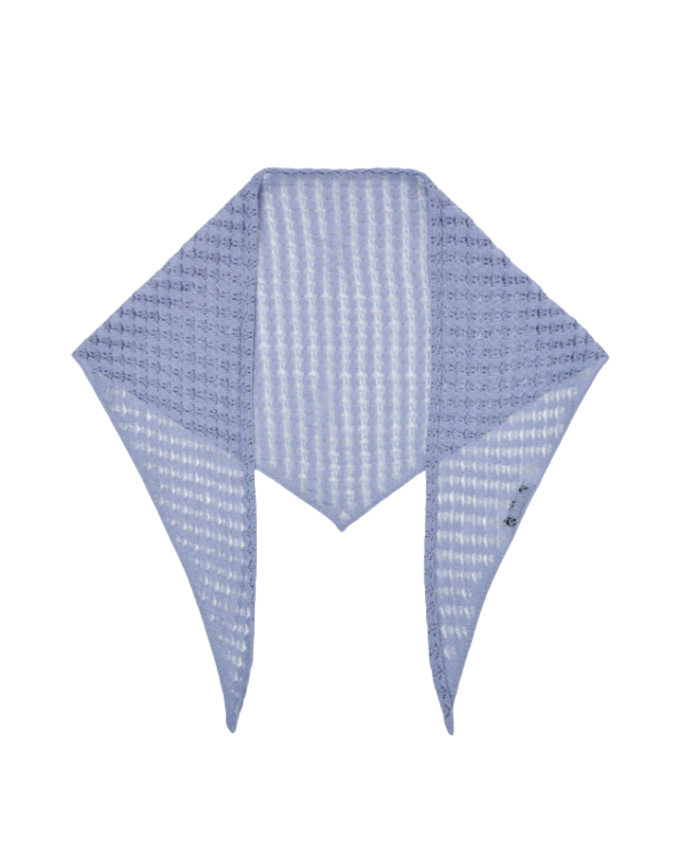 Triangle neck scarf knitted a lace-like open stitch from a corded organic cotton yarn with a dry hand feel.