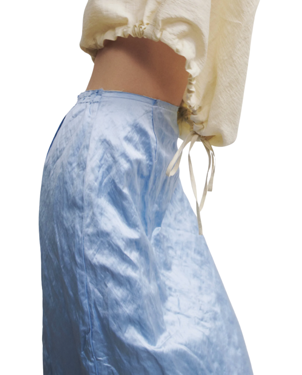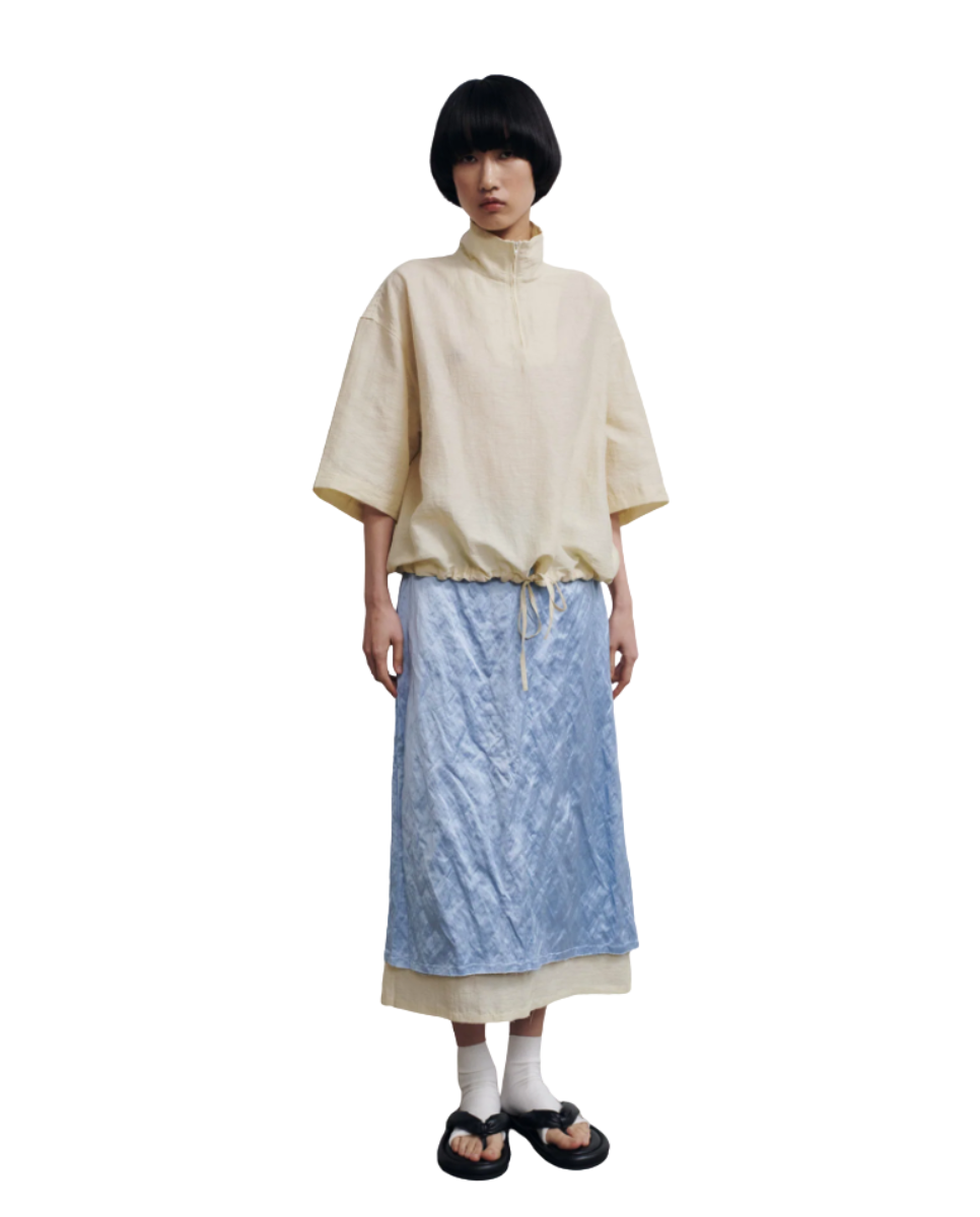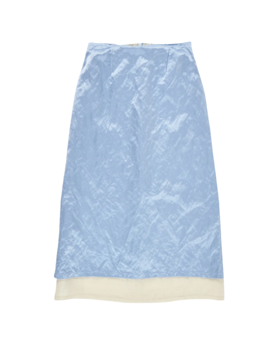 Layered midi skirt crafted from satin with metallic fibers, giving it a subtle lived-in texture, paired with a textured linen inner layer. Features a frayed waist and hem, exposed darts, and a back split. The outer layer sits slightly shorter than the inner layer, creating a layered effect.
