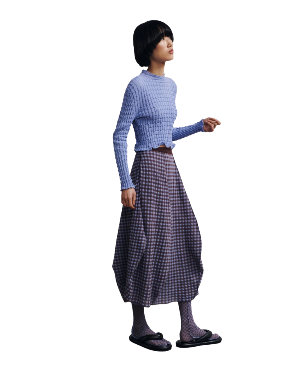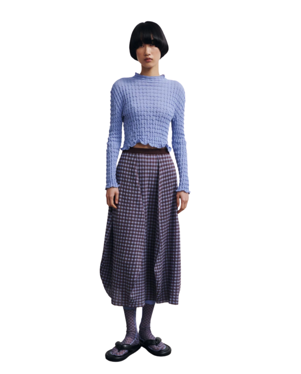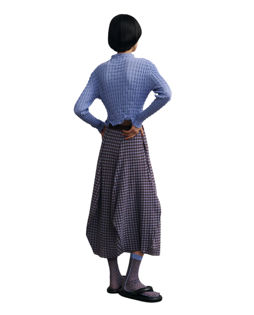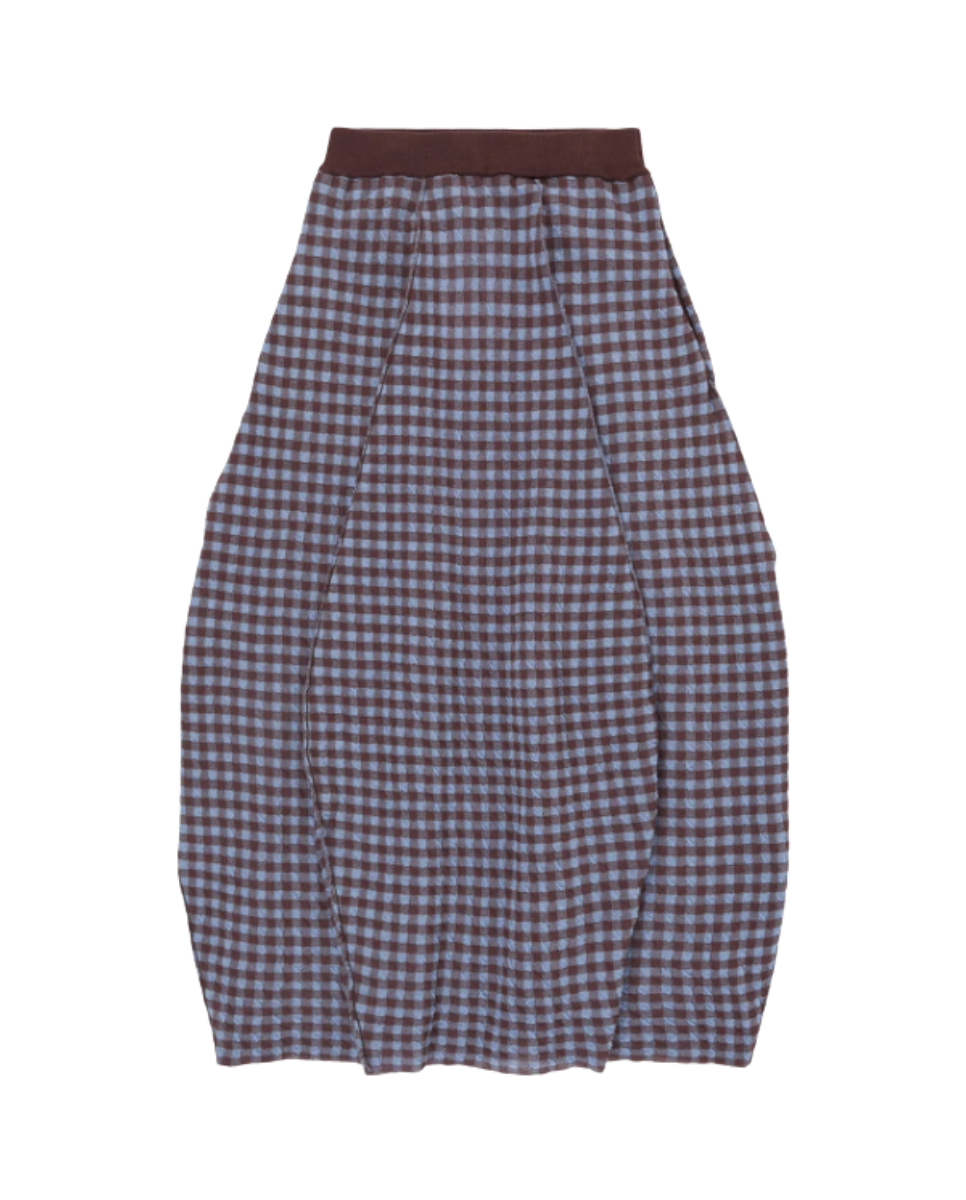 Balloon midi skirt crafted in a lightweight gingham two-tone textured jacquard, knitted from ultrafine makò cotton. Rounded panelled structure featuring exposed seams, side pockets and a ribbed elasticated waistband.