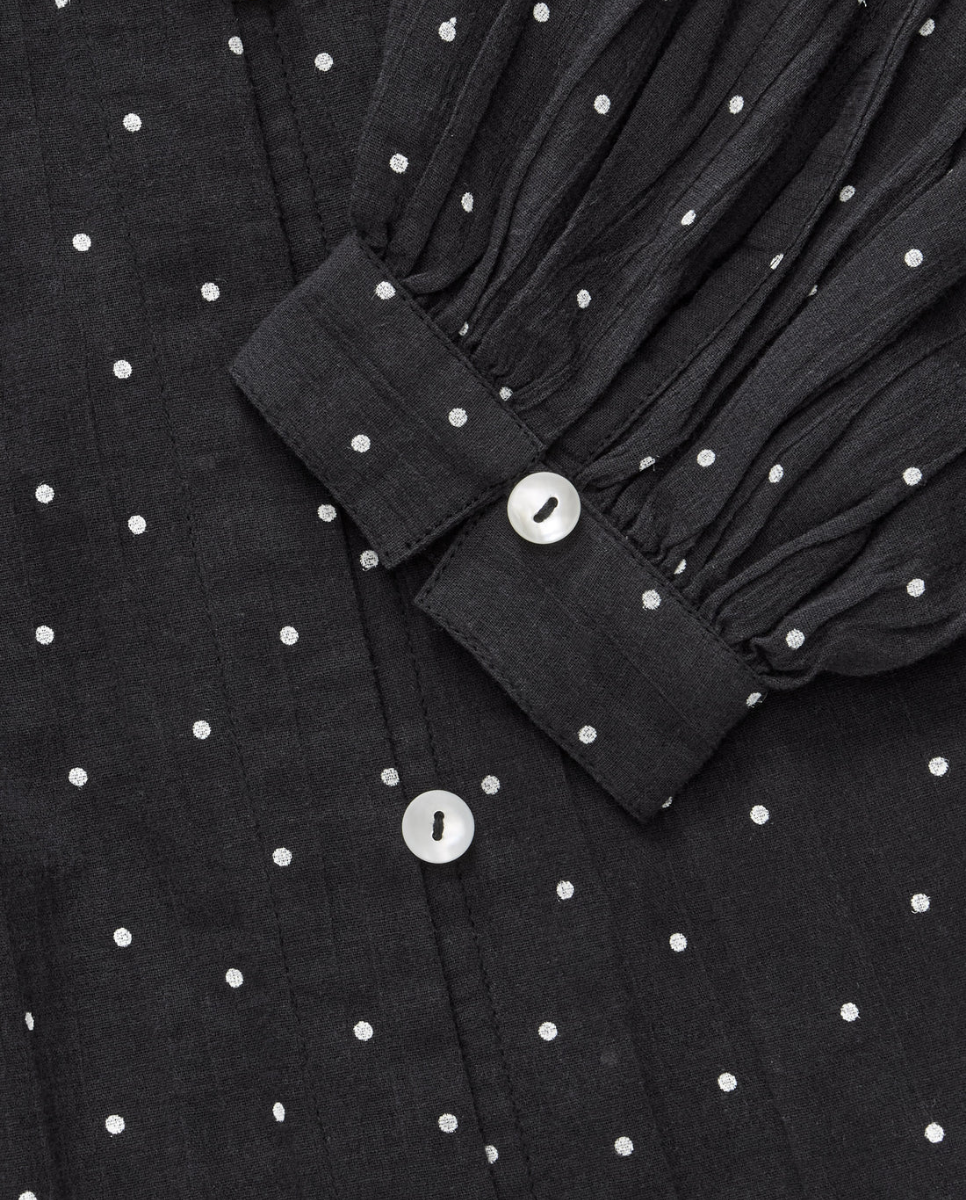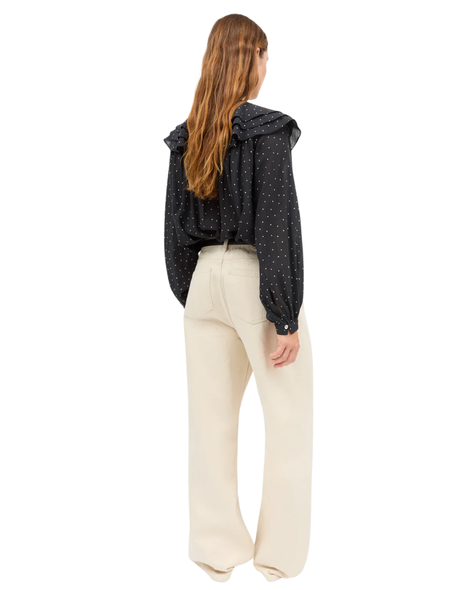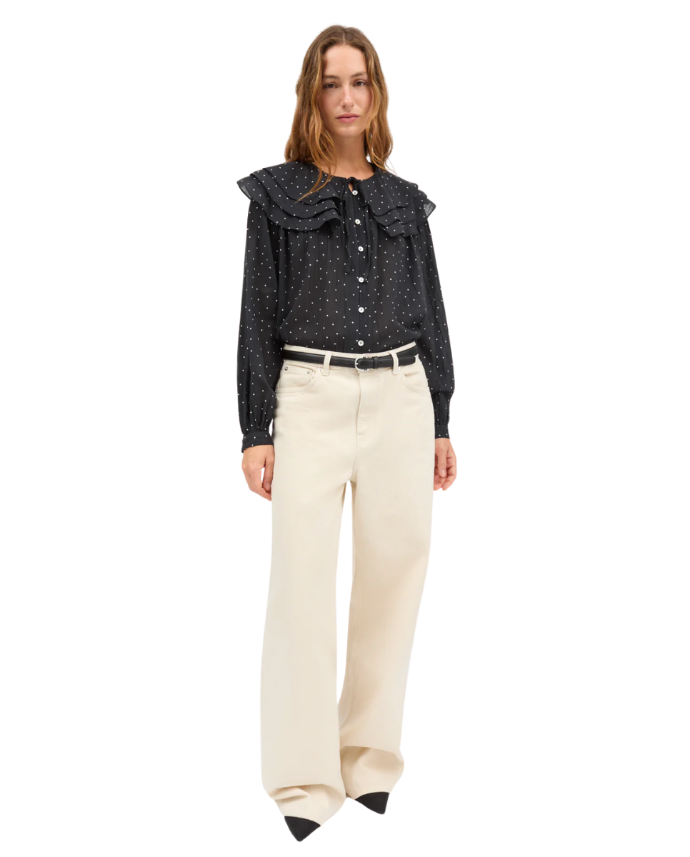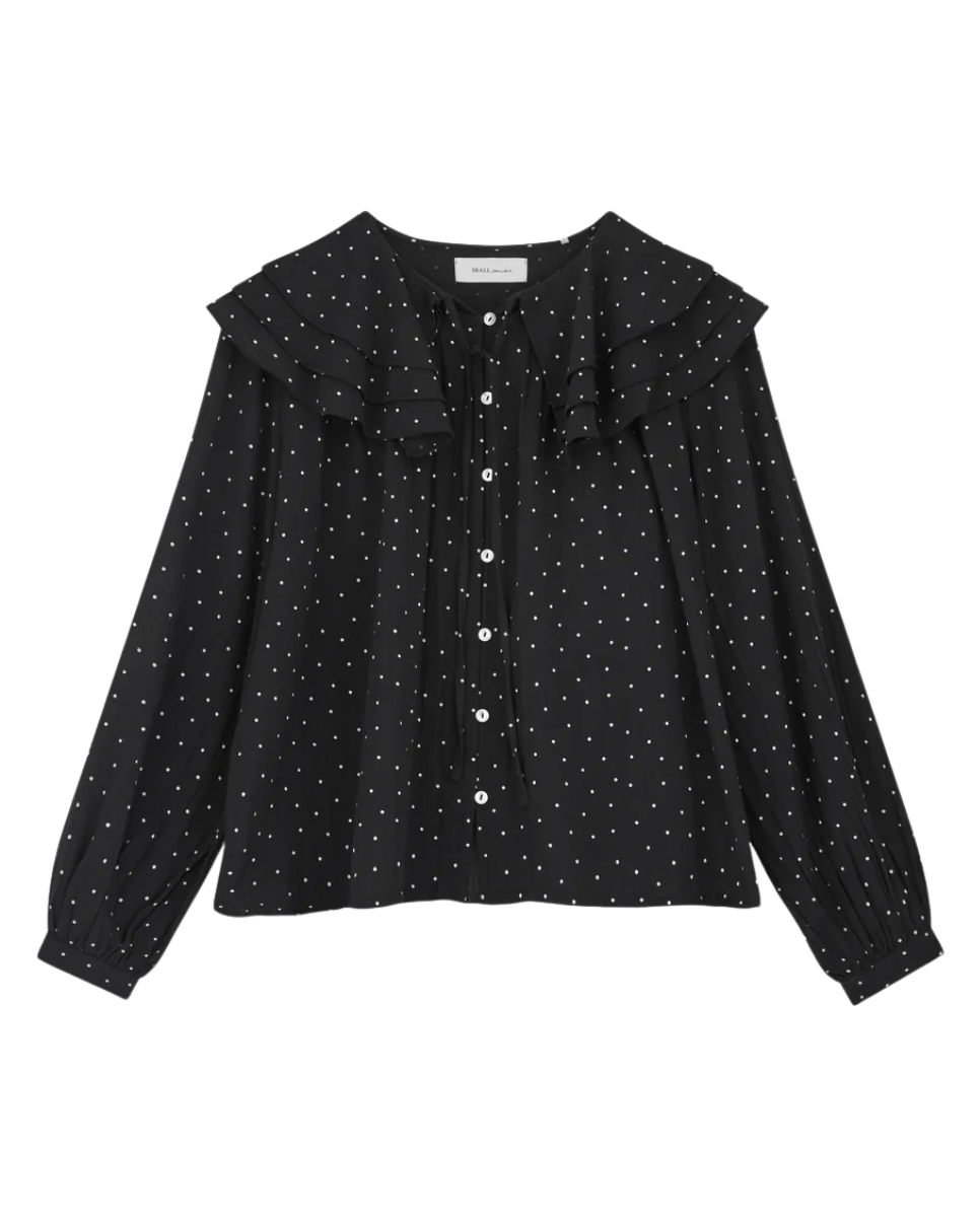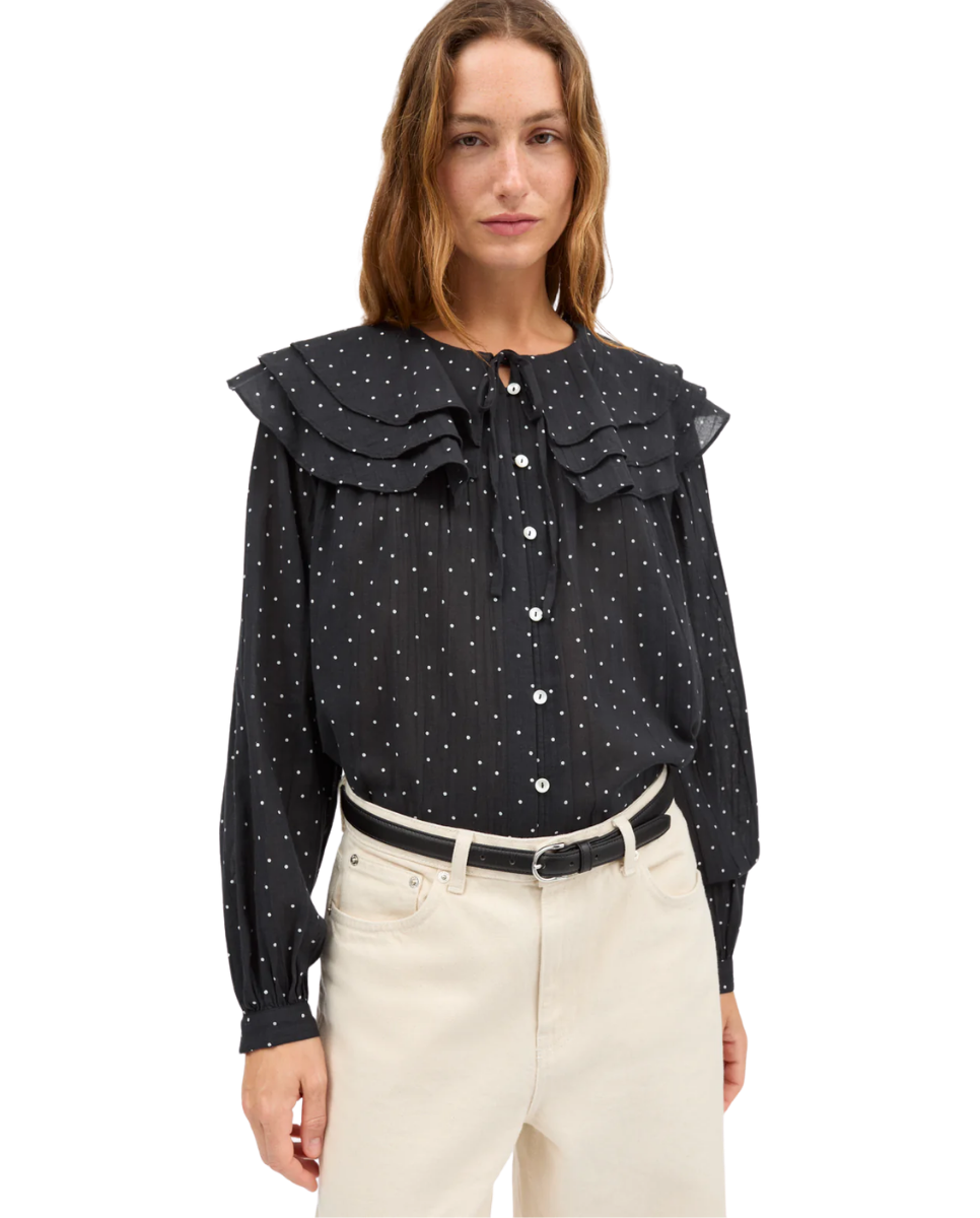 This blouse is designed with a three-layer flounced collar and tie-neck detail, complemented by voluminous sleeves, a button-and-loop closure, and is crafted from 100% GOTS-certified organic cotton for a soft, refined finish.