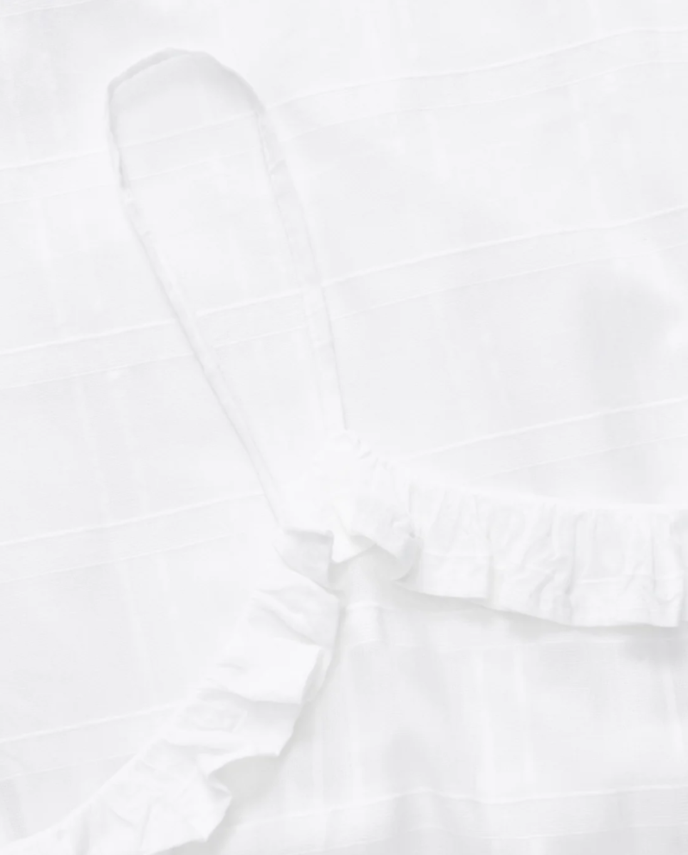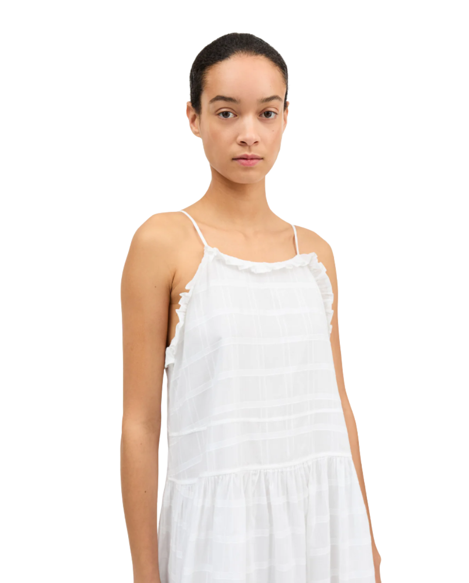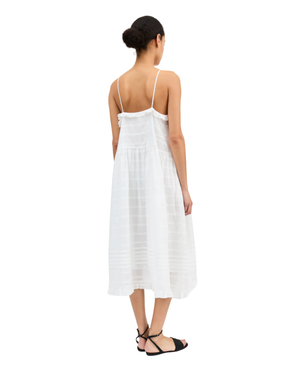 Maxi strap dress with frills and pintucks, adjustable shoulder straps, gathering at the waist and pleats at the bottom.