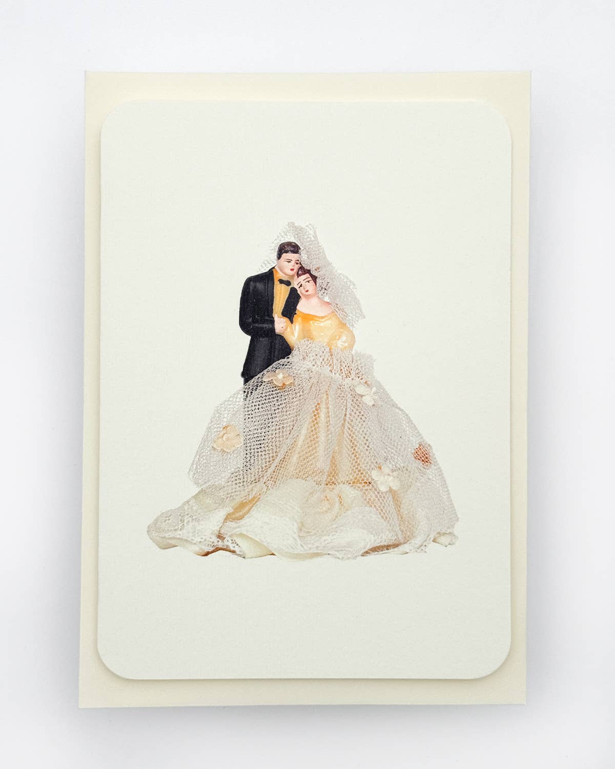 A charming greeting card featuring an antique wedding cake topper, styled and photographed by Alexandra Simms.